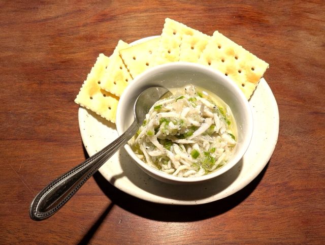 料理もまた、お酒によく合うラインナップ。こちらはお通しのシラスのアヒージョ。