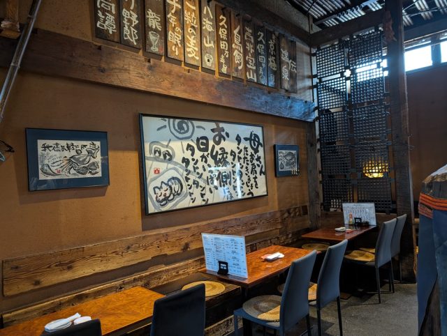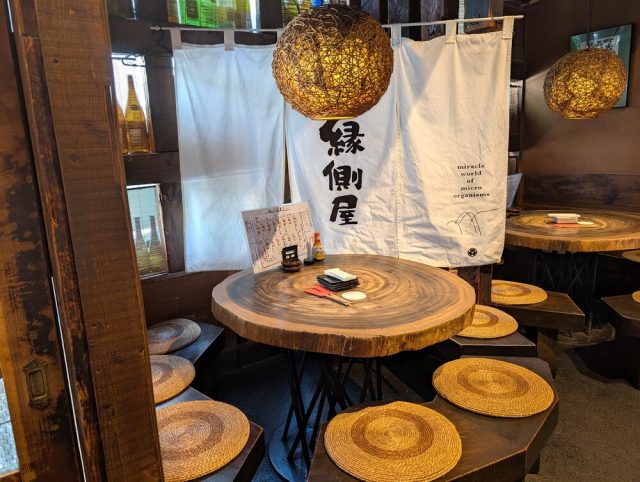 「縁側屋」の店名ロゴと同じ筆文字で描かれた、大きな詩が記された壁掛けや、切り株のテーブル、編み込みの座布団、照明のカバーなど、インテリアにもこだわりを感じます。