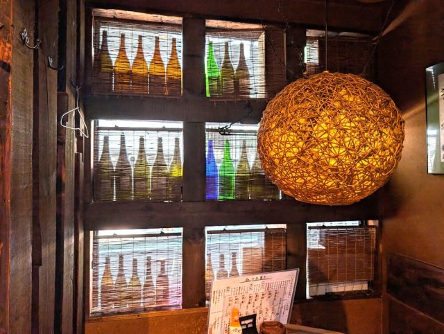 縁側屋には、たくさんの日本酒のビンが飾ってあります。