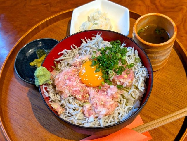 鮮やかなピンクのねぎとろに、白いしらすがぐるりと囲み、彩りと食感のバランスが楽しめます。しらすは塩気があり、ねぎとろの甘みを引き立てるアクセントになっています。