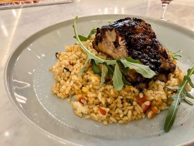 しばらくして運ばれてきたスペアリブジャンバラヤは、期待以上のボリュームとうつくしい盛り付けに驚きました。大きな自家製スペアリブが二つ、色鮮やかなジャンバラヤの上にどーんと乗っています。見た目からして食欲をそそる一品です。