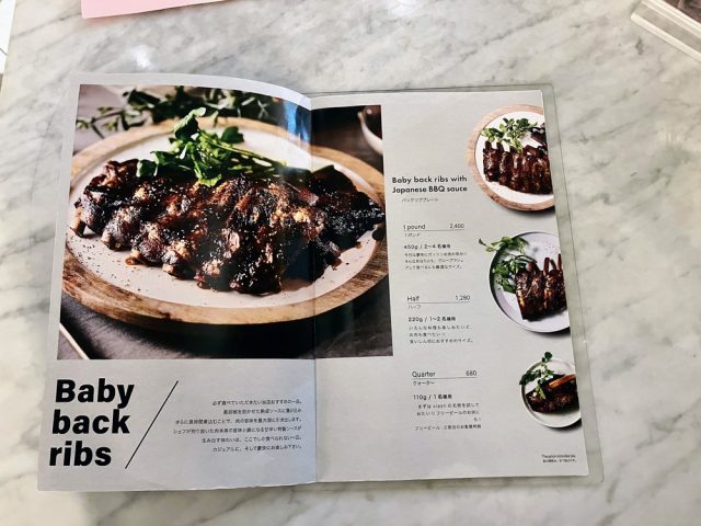 フードメニューを開くと一面にスペアリブの写真が広がっていました。黒胡椒をきかせた熟成ソースに長時間つけこみ、肉の旨味を最大限に引き出しているとか。せっかくなのでお店のおすすめの一品をいただきたく、スペアリブジャンバラヤとキールを注文しました。