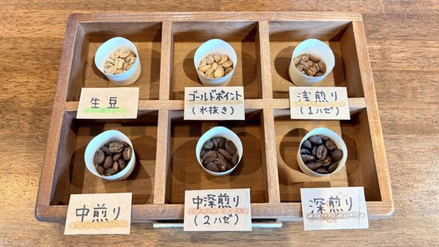 この日は、コロンビア・シドラ/エチオピア・カラモ/コロンビア・カウカ/マンデリン・アチェ/パプアニューギニアの5種類。それぞれ豆の個性に合わせて、浅煎り・中煎り・中深煎り・深煎りから選べます。