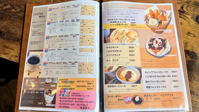 窓際の席に通していただくと、住宅街の中とは思えないほど穏やかで、自然と肩の力が抜けていきます。メニューを開くと、以前と変わらず豊富な珈琲のラインナップが並びます。