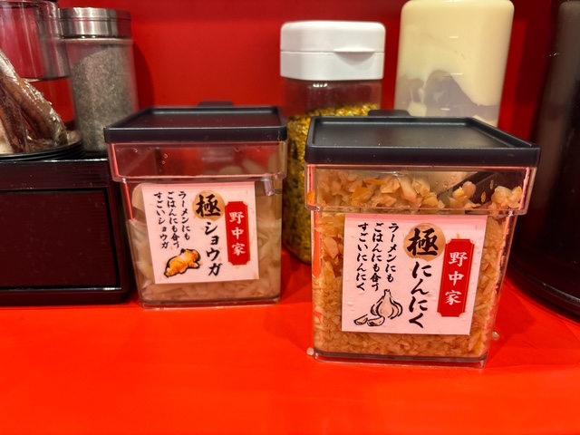 卓上には「極みニンニク」「生姜」「マヨネーズ」「ふりかけ」など調味料も充実。