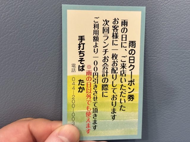 お会計は現金のみなので、現金をお忘れなく。最後に「雨の日クーポン券」をいただきました。