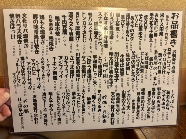 単品の天ぷら、だし巻き玉子、サラダ、刺身など。