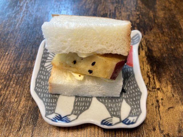 続いては「ポコ食パン」。翌朝のトーストももちろん絶品なのですが、私は断然「買ってきた当日、焼かずにそのまま」派です。手でちぎる瞬間の、吸い付くような柔らかさと立ち上る小麦の甘い香り。今回はそのままでも十分おいしい生地を使い、大学芋とクリームチーズを挟んだ贅沢なサンドイッチにアレンジしてみました。