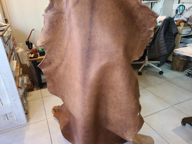 「お店には、国内ではすでに流通していない革を使用して作ったものが多くあるんですよ」と齋藤さん。そしてたくさんあるストックの中から加工前の一枚を見せていただきました。