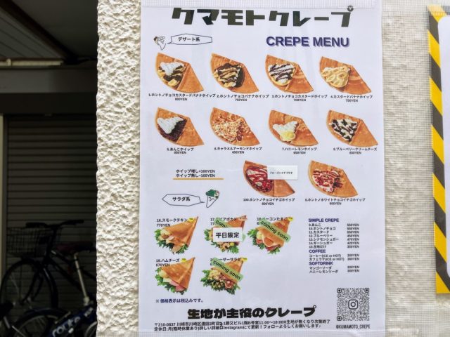ヤマグチクレープのフランチャイズ加盟店である「クマモトクレープ」というお店のようです。千葉県を中心に店舗を広げており、『生地が主役のクレープ屋』をテーマにこだわりのクレープを販売しています。川崎には初出店で10月5日にオープンしたばかりでした。