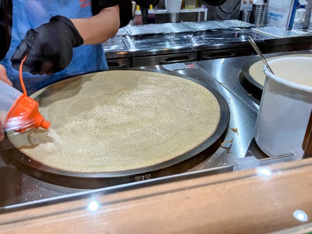 順番になり、入店すると店内はとてもコンパクトなつくり。カウンター越しにお店の方がクレープを焼く様子を間近で見ることができます。子どもたちは目を輝かせながら、生地が鉄板の上でくるくると広がっていく様子に見入っていました。