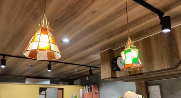 温かみのあるペンダントライトや、遊び心を感じさせるキルティングのクレープの入れ物がかわいらしく心温まる空間になっています。