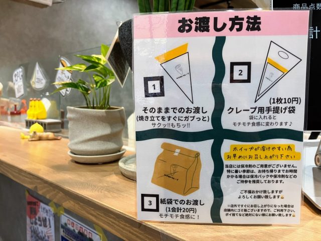 クレープ用手提げ袋なんてものがあると私は知らず、自転車で来ていたこともあり手提げを選びました。正直、クレープを手提げで持ち帰れるなんて考えたこともありませんでした。