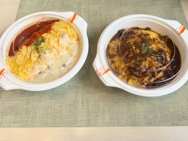 購入したのは、左から「キノコ&トマトあいがけオムライス」と、「デミグラスオムライス」。