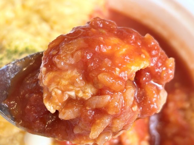さらにフワフワの卵と、チキンライスにソースがよく絡みます。
