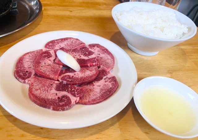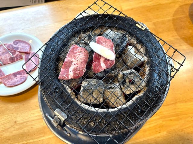 「炭火焼肉 大幸」を訪れたら、まず味わってほしいのがネギタン塩。七輪の上でジュウっと音を立てて焼ける薄切りの牛タンに、たっぷりの刻みネギがのった贅沢な一皿です。