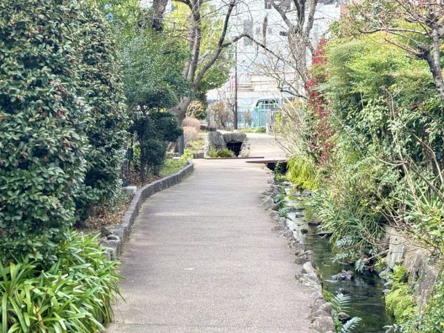 バス停「宝蔵院前」で降りてすぐの場所から、入江川せせらぎ緑道に入れます。
