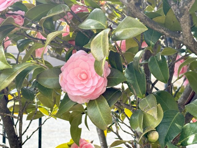 少し高い位置に目をやると、オトメツバキが顔をのぞかせていました。