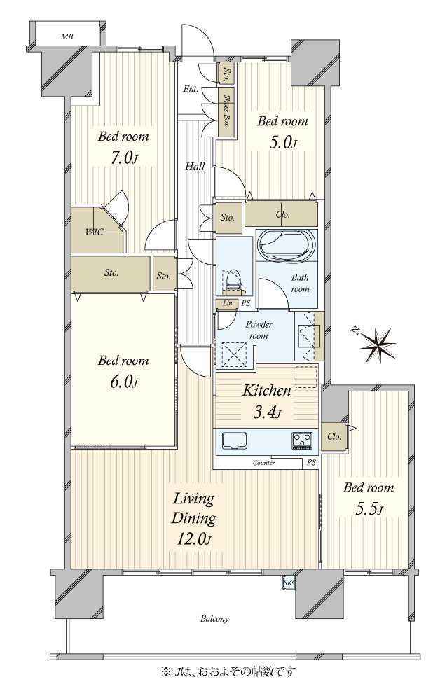 ※略号凡例・・・L=リビング、D=ダイニング、K=キッチン、MB=メーターボックス、PS=パイプスペース、S=サービスルーム(納戸等)、WIC=ウォークインクロゼット、SIC=シューズインクロゼット、TR=トランクルーム