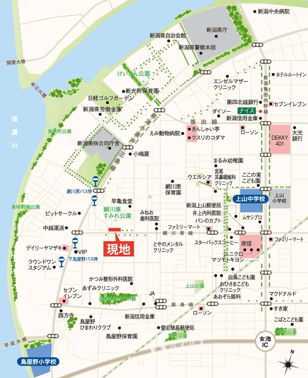 - 新潟交通バス「網川原」バス停徒歩5~6分