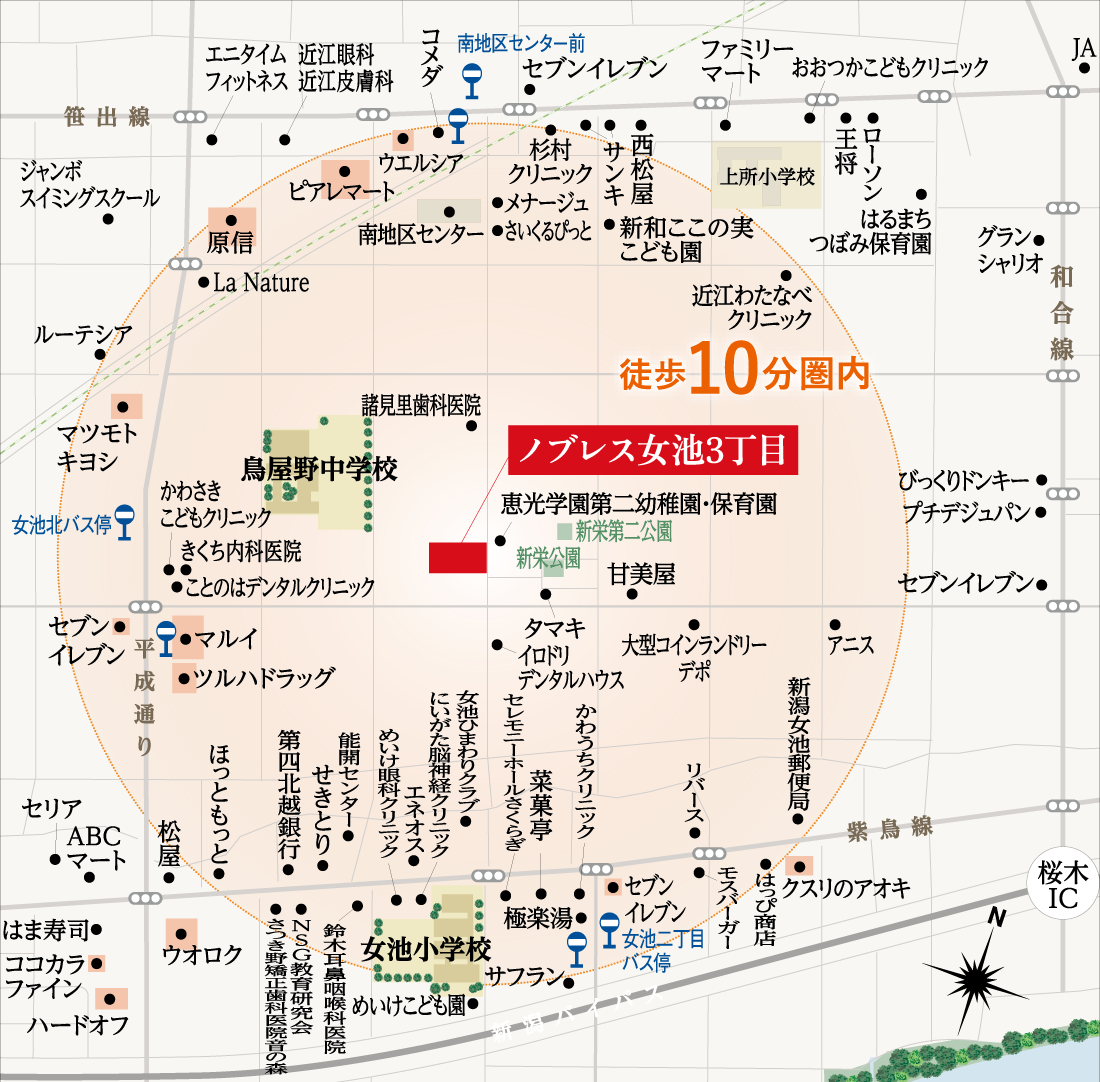 - 新潟交通バス「女池2丁目」バス停留所から徒歩8~9分