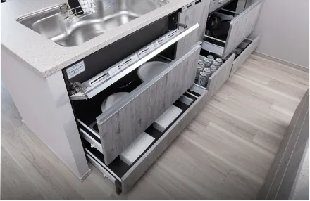 奥に入れたものが見やすく、取り出しやすいスライド収納。スムーズに開け閉めできるソフトクローズ機能付です。