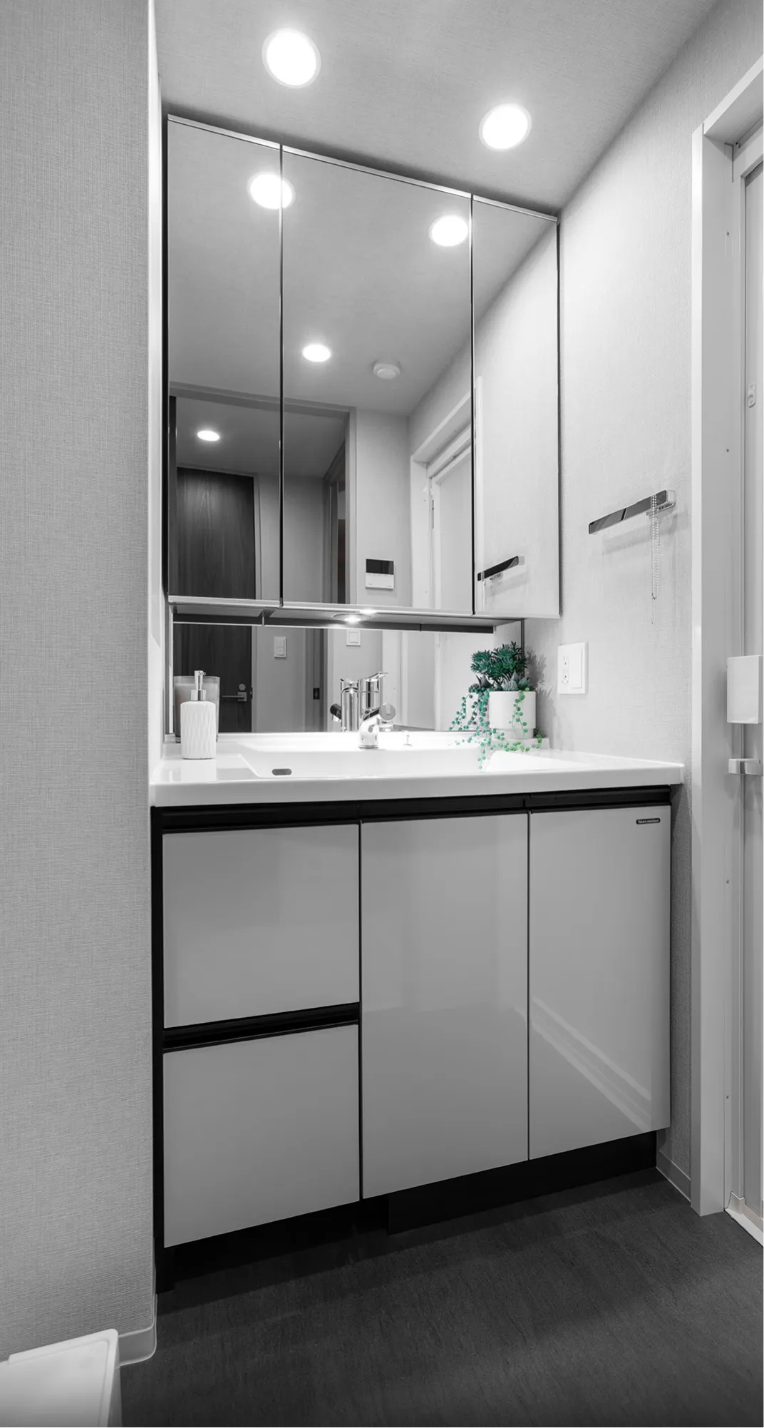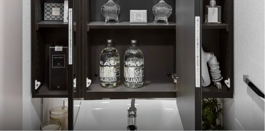 ミラー扉の裏側は全て収納スペースとなっており、化粧品などの小物がすっきり収納できます。