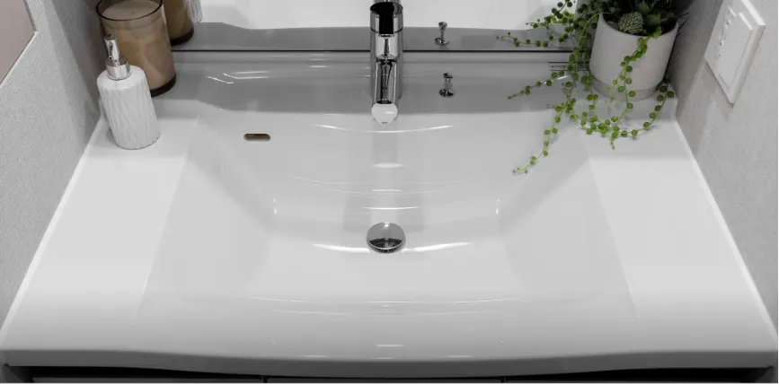 デザイン性を重視した質感と、シンプルゆえの高級感を演出。継ぎ目のないボウル一体型カウンターで隙間汚れを防ぎます。