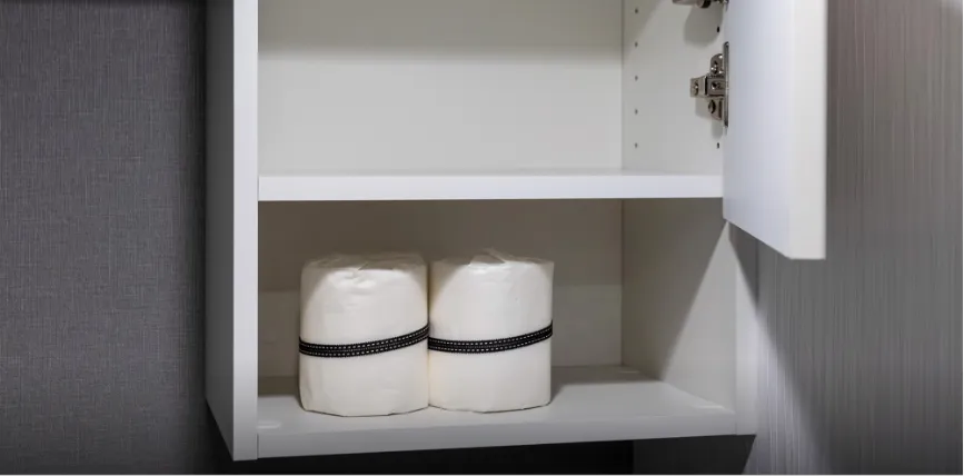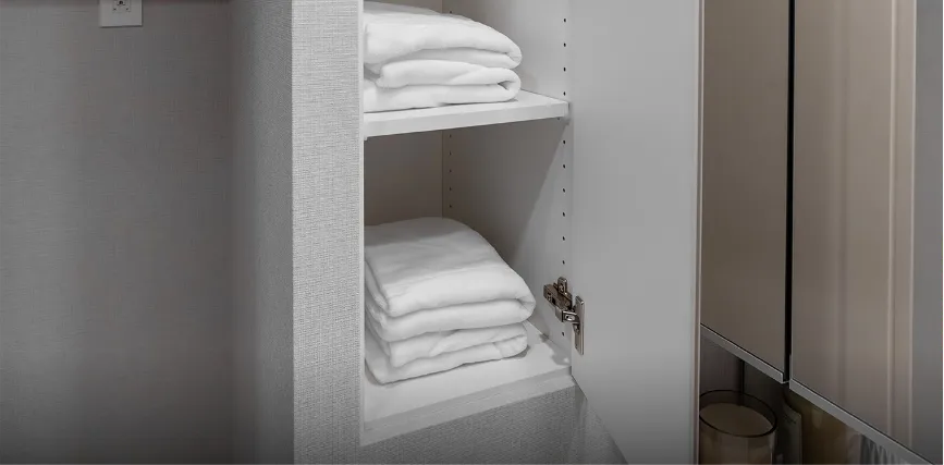 日常的に使うリネン類や日用品を効率よく収納。扉付きのため生活感を隠しながら、オープン棚にすれば必要な物をすぐに取り出せます。