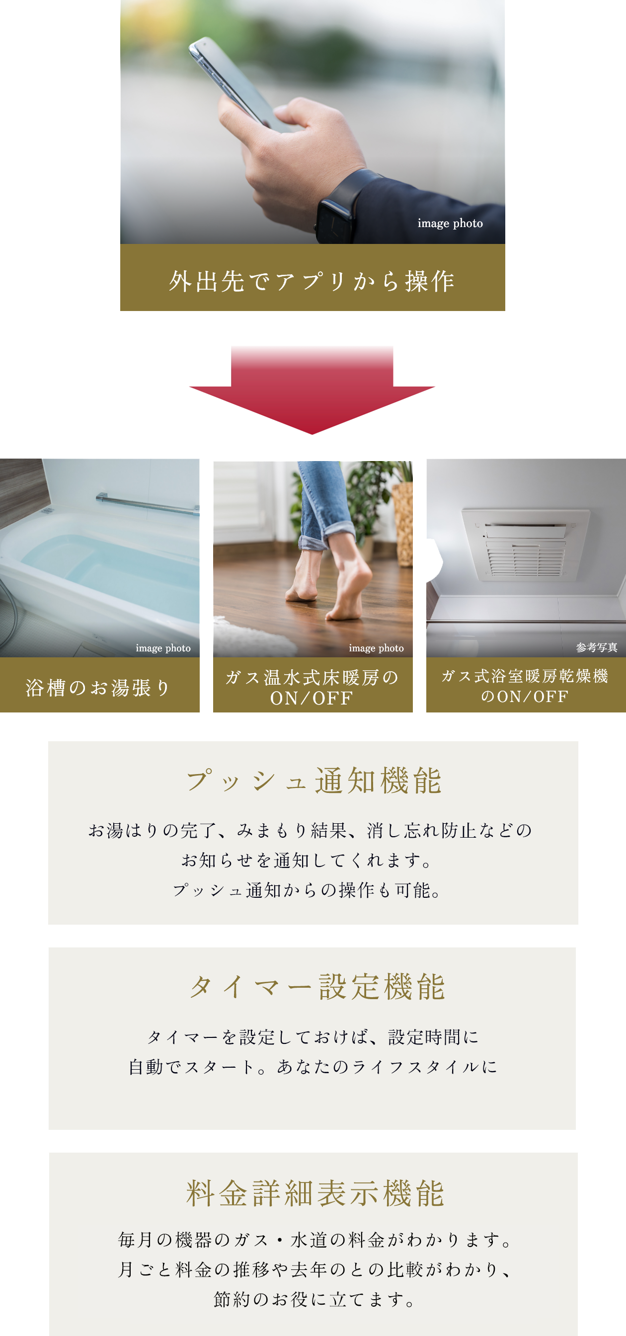 ※スマートフォンは iPhoneiOS14 以降・ Android8 以降に対応。タブレット端末は iOS のみスマートフォン用アプリで使用可能。 iPhone は、 Apple Inc. の登録商標です。 Android は Google LLC の登録商標です。 家庭用の無線 LAN ルーターをご使用ください。モバイルルーター( ポケット Wi Fi )デザリングでの使用はできません。また、無線 LAN に接続可能な環境下に限ります。※給湯温度が 50 以上の高温設定になっている場合や、出湯中の場合は操作できません。※情報は2025年 10 月時点での情報です。※全ての機種( OS アップデートを含む)で動作を保証するものではありません。
