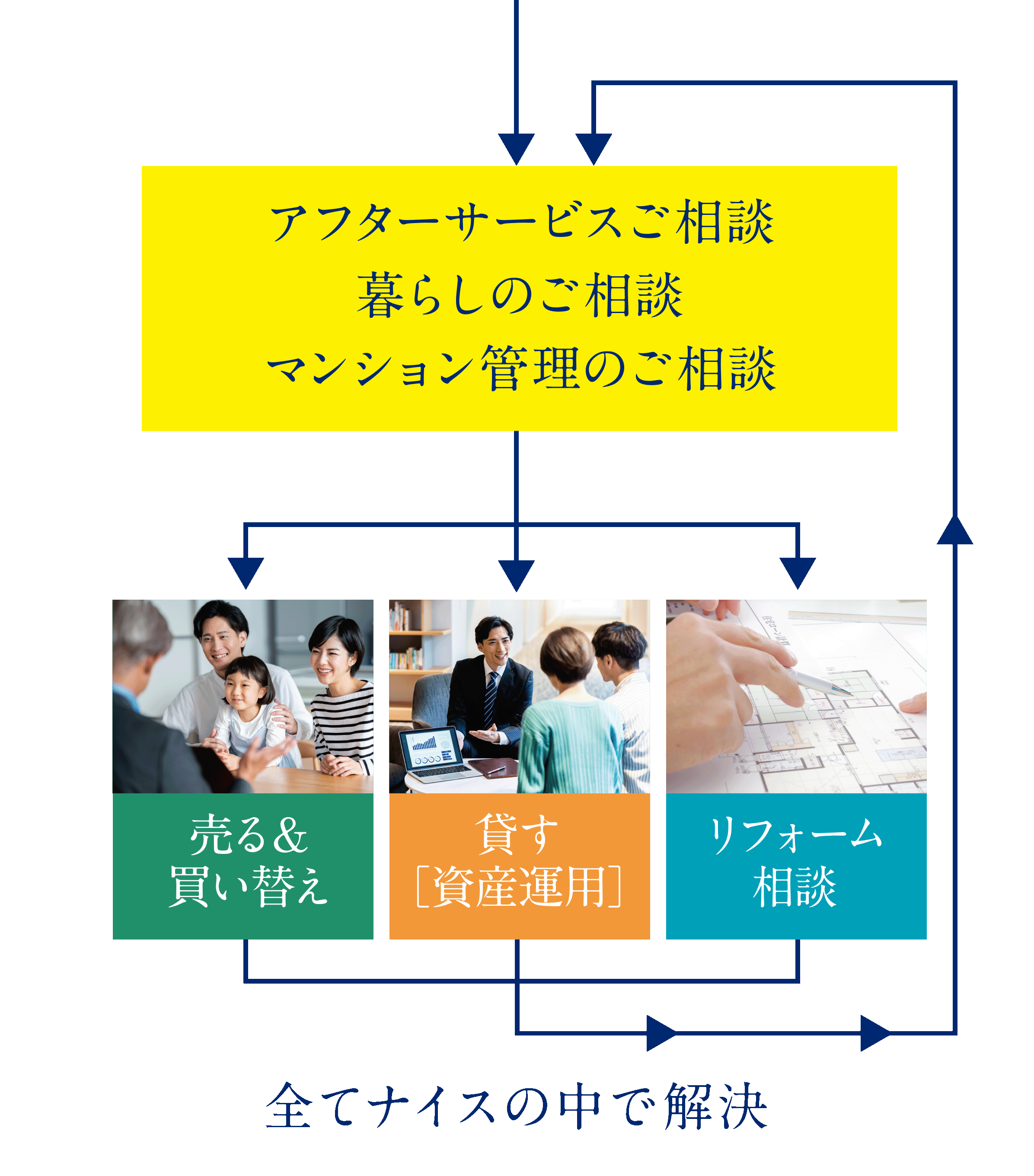 様々なお客様からのご相談を、オールナイスで解決。ナイスは、新築マンション販売、一戸建て販売など領域ごとで会社を分けておらず、全ての領域をナイス株式会社が取り扱っているからこそ可能となります。だから、様々な視点からお客様に最適なお住まいをおすすめできます。